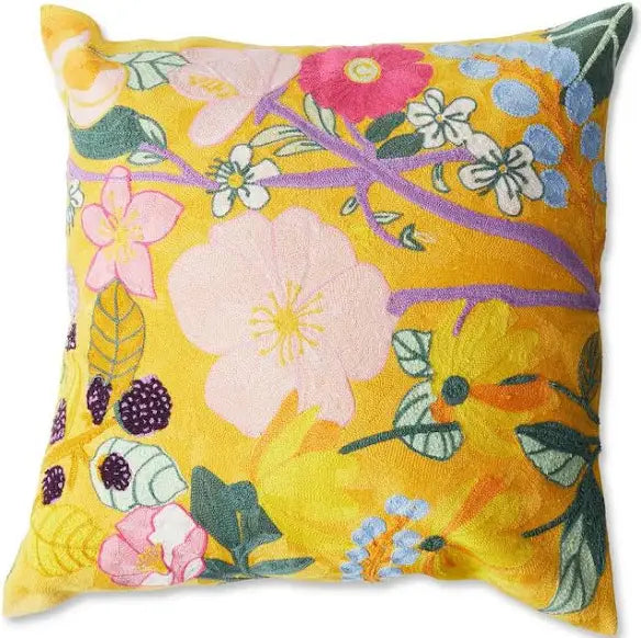 A feature cushion is the perfect addition front and centre on your bed or to perch upon your favourite armchair or sofa. Add that extra something special with the Abundance Marigold Embroidery Cushion. With full front embroidery in our Abundance print, a fun and fruity floral as pretty as ever and bursting with colour and blooms on a golden yellow base with plain pale pink reverse