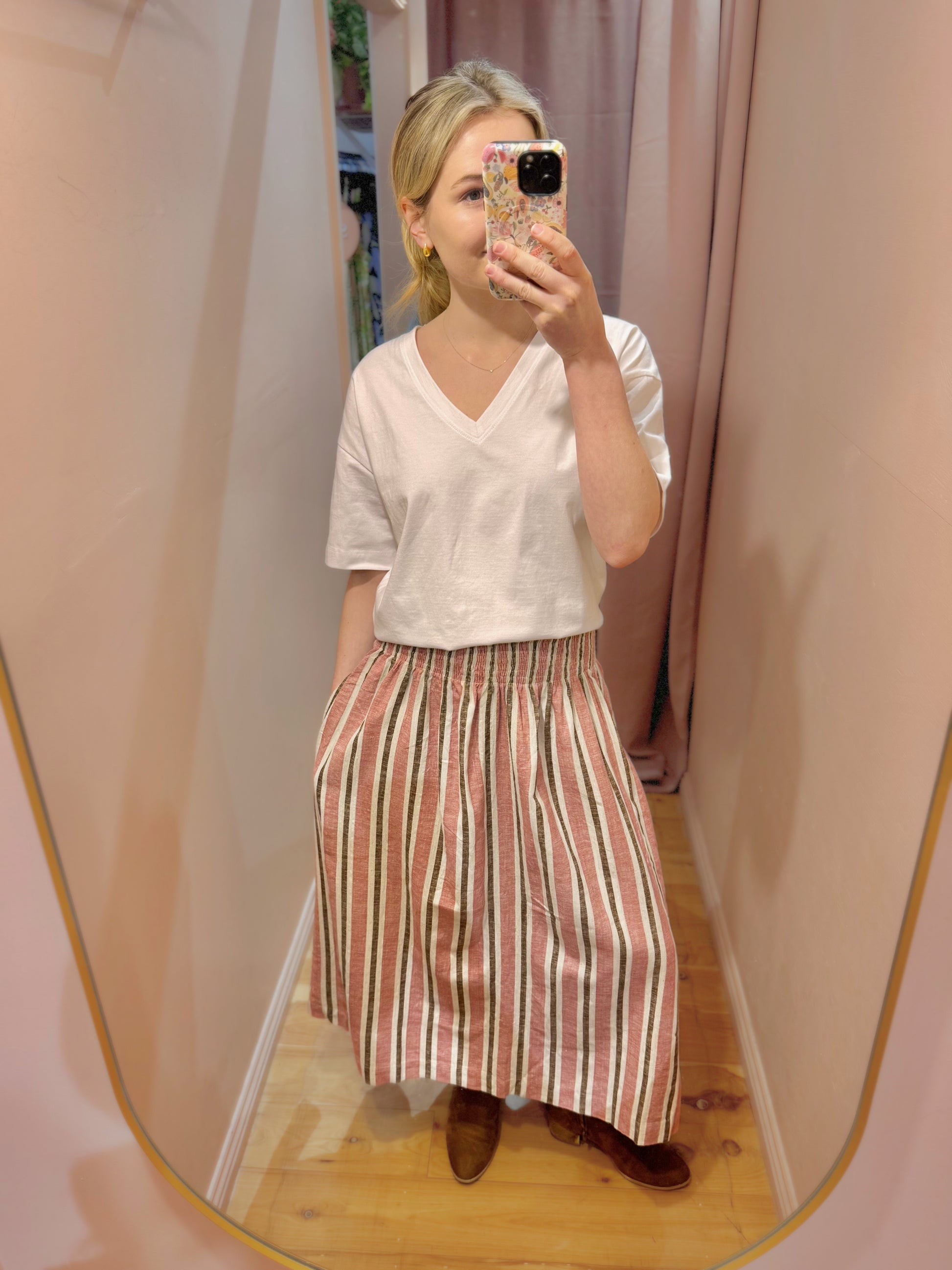 The elasticated waistband gives a relaxed fit which is perfect for tucking in knitwear or tees, while the full gathered skirt falls beautifully without feeling fussy. Of course, she has pockets because we know that’s non-negotiable.