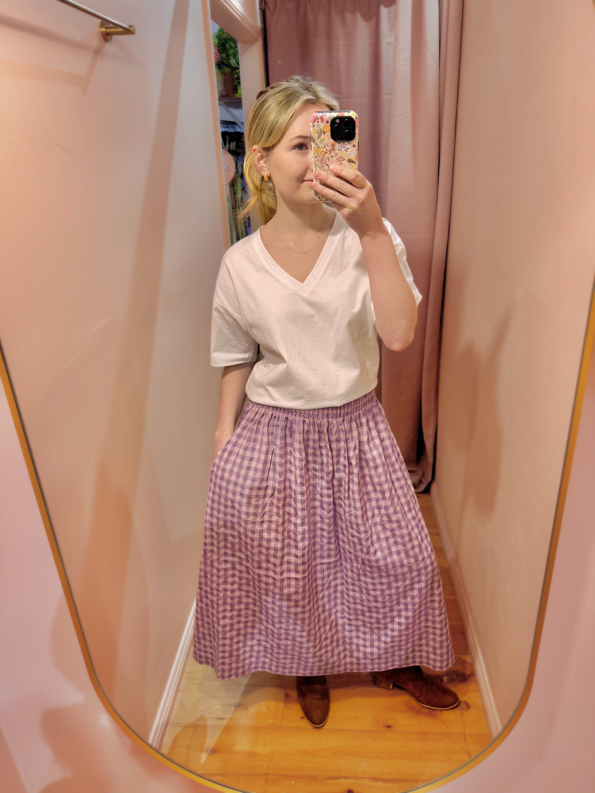 The Elsie Skirt is an easy throw-on style designed for everyday life. Comfy enough for school drop-off, cute enough for coffee dates. She’s Australian-designed, handmade and finished in our signature Cotton Lilac Check.