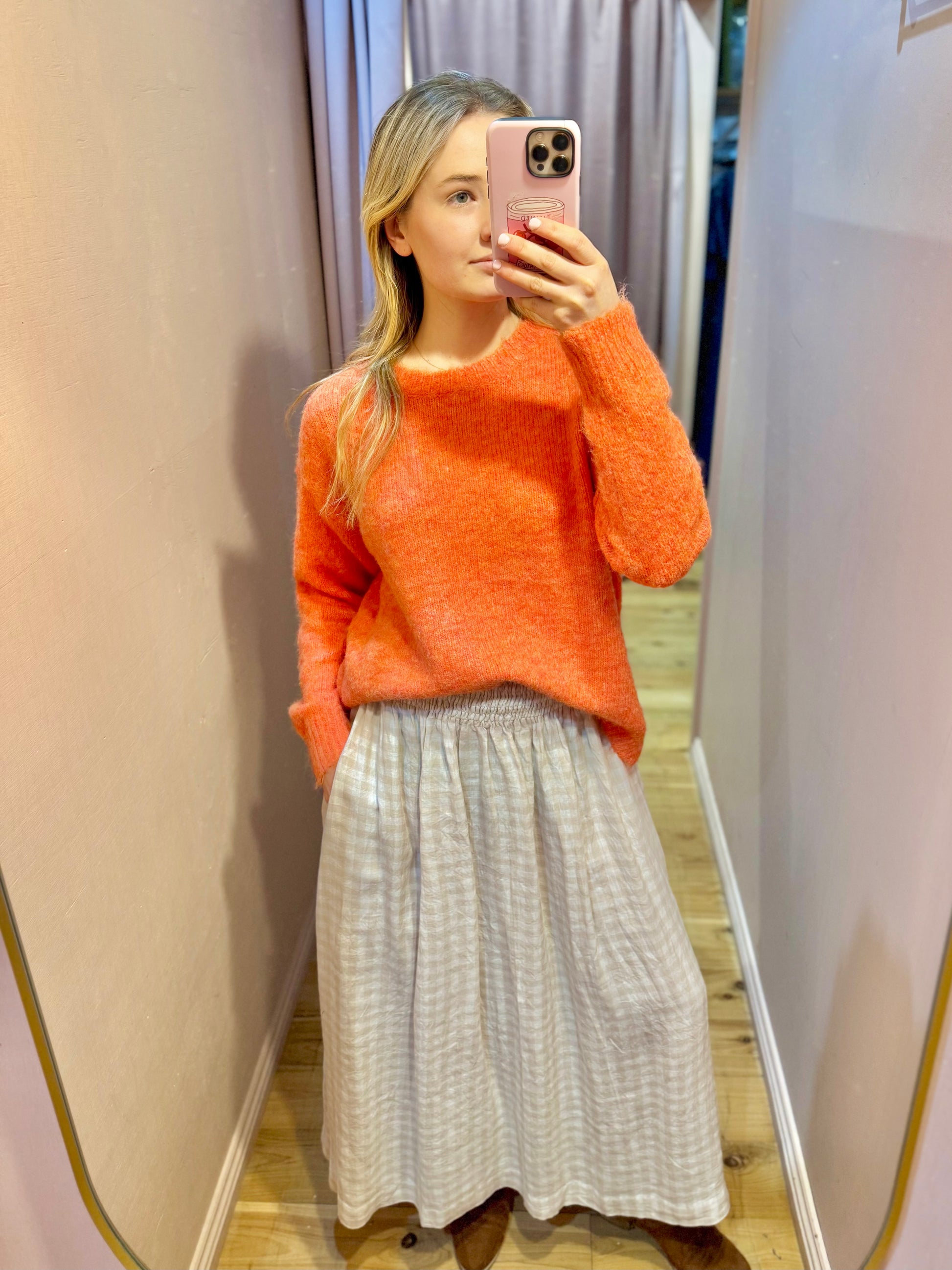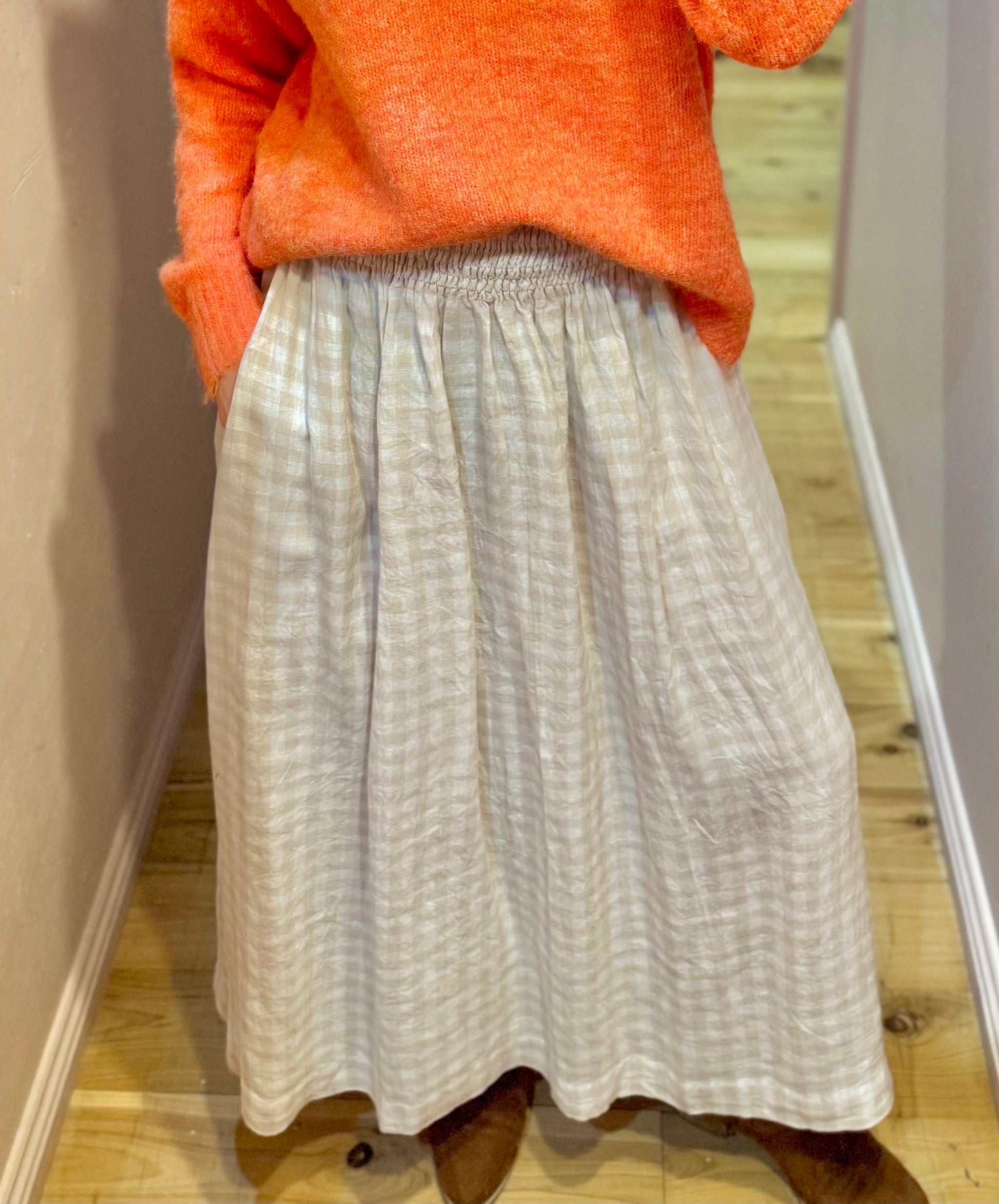 The elasticated waistband gives a relaxed fit which is perfect for tucking in knitwear or tees, while the full gathered skirt falls beautifully without feeling fussy. Of course, she has pockets because we know that’s non-negotiable.