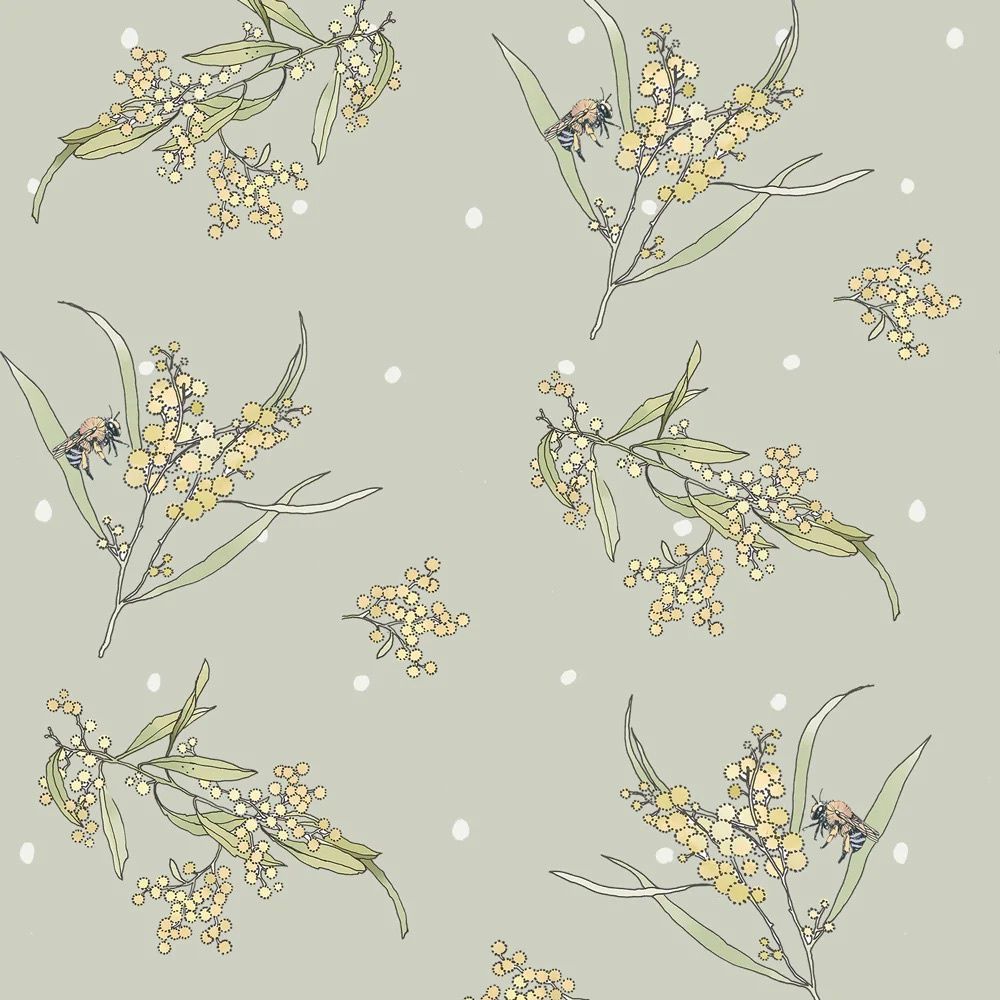 The buzzing of bees has a calming effect on grown ups. And little ones too! That’s why this baby comforter features the Australian native bee in its natural habitat doing what it’s doing best: buzzing away among glorious yellow Wattle flowers.